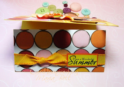 I started off initially not knowing what to create but I sort of played around with a few embellishments to see how it would look and I decided that the big prima flower fits into the theme. There was no rubber stamping with this card. I printed the sentiment from my computer because I didn't have a "summer" sentiment.